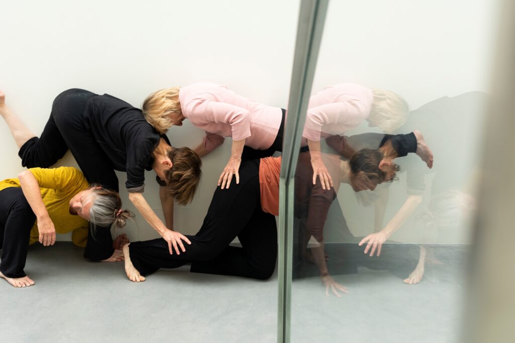 Das Kollektiv dance me to the end besteht aus Tanzschaffendenen über 60 und befasst sich mit der Frage nach dem Körper als Gedächnis von Erinnerungen. Ist das Körperarchiv ein Fundament, ein Teil von dir? Bewegt es sich? Ist es ein Behältnis? Kannst du dich hinein- und wieder raus begeben? Tänzerisch als auch dialogisch gehen Tänzer*innen in Resonanz mit diesen Fragen und lässt ein interessiertes Publikum an diesem Prozess teilhaben.